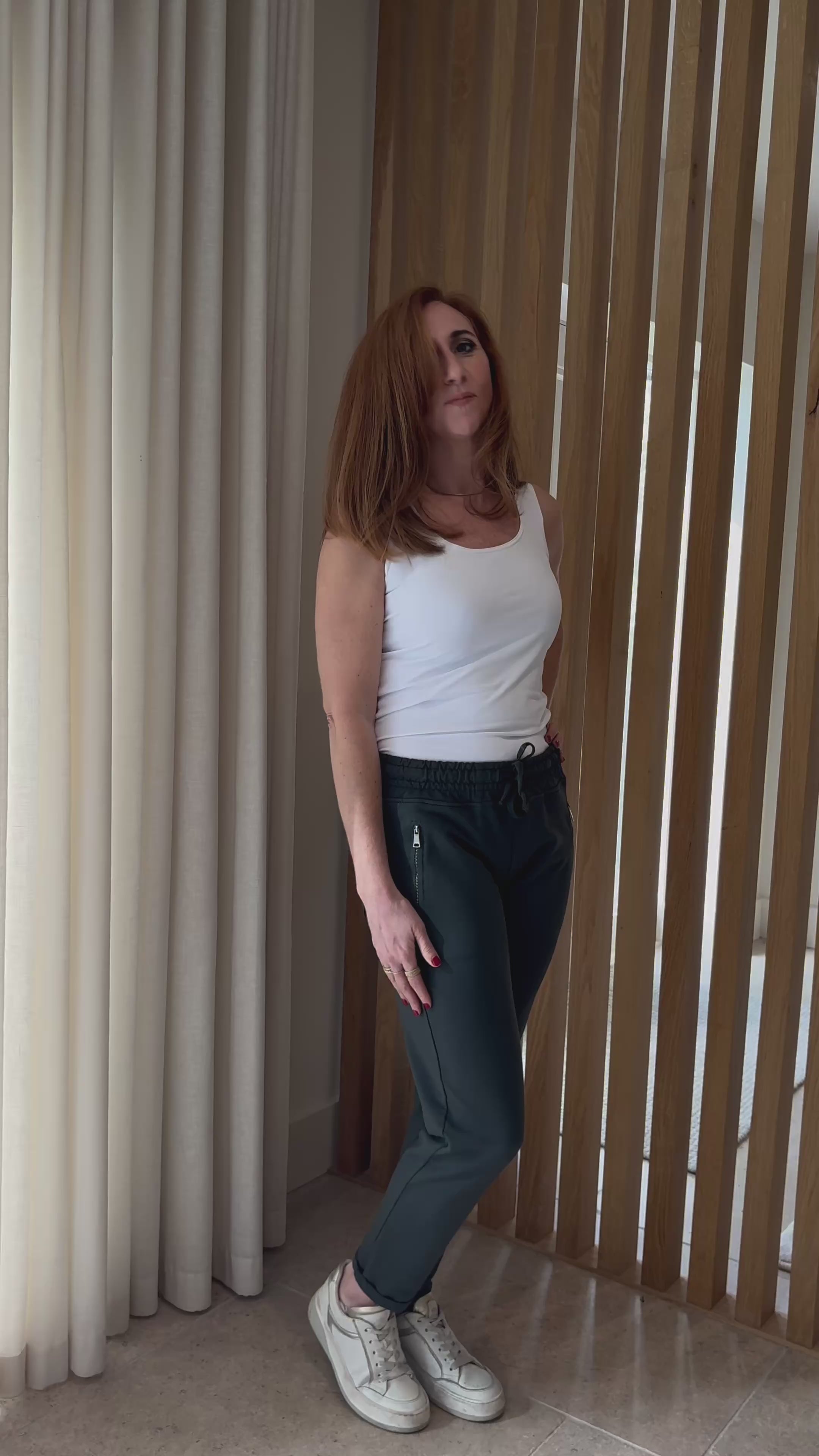 DECK easy wear jogging style trouser.  Elasticated corded waist, front zip pockets and back patch pockets.